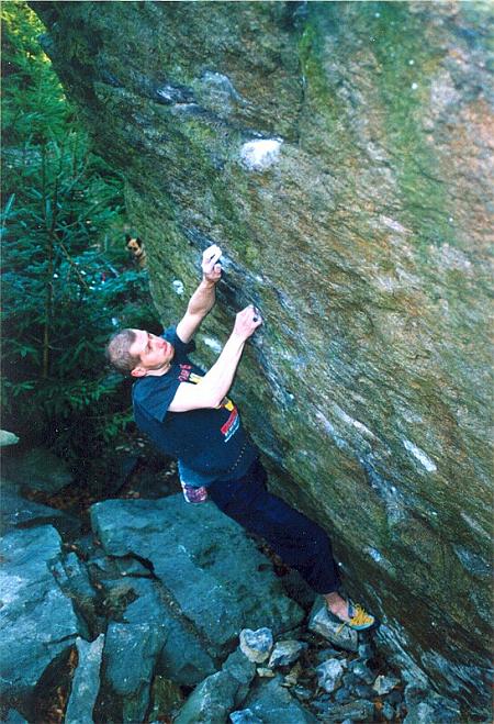 Na závěr pozvánky Ostrá skalka, kousek od Bílé skály. Pavel Johny Jonák v boulderu opět od Tondy Páleníčka. Pětikrokový traverz za velmi malé a ostré lišty se špatnýma nohama. Klasifikace? Tondu se mi nepodařilo zkontaktovat.