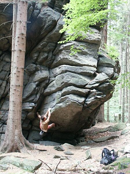 Zajímavě přilepený kámen pod cestami Černá spára a Manitou. Dá se na něj vylízt třemi variantami, z čehož na fotce je  nejtěžší 7.