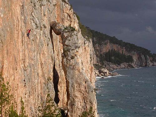 No a teď k lezení. Oblast je přímo u moře, pár cest vede traversem nad mořem. Cesty jsou dlouhé cca 45 m. Výborně odjištěné borháky, na slaňování jsou připraveny prasečí očka s dojištěním přes druhý borhák a erární karabinu.