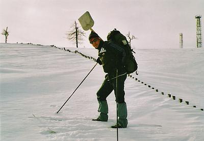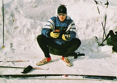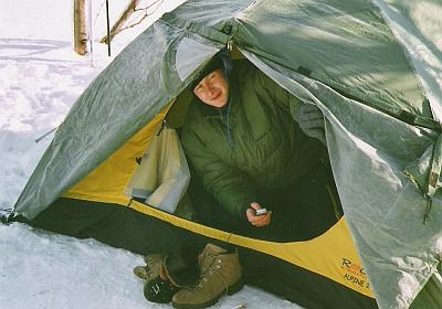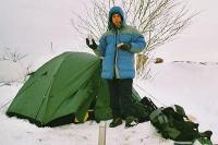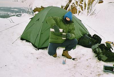 Shazujeme batohy a zkoumáme vítr, aby nám příliš nefoukalo do „ložnice“. Na zbytečné přemýšlení není moc času. Vybíráme místo na stan, který máme letos s sebou poprvé (!). Dosud jsme bivakovali jen na karimatce ve spacáku, v mělkém zákopu nebo schovaní pod závětrným převisem. Teploty se pohybovaly od -17°C do -13°C. Všude pod sněhem, kterého i tady nahoře místy leží 2 – 3 metry, jsou obrovské balvany a větve stromů. Jedno z míst se zdá být vhodné a po půlhodince střídavého odhazování a tvoření základu začínáme stan stavět. Prsty bez rukavic rychle ztrácí citlivost, jinde samozřejmé zavázání kličky na vrcholku tropika se tady stává hodinářskou a po dvaceti marných pokusech vyčerpávající záležitostí. Ovšem vždy se může stát něco nepředvídatelného, co by jste ale přece předvídat měli! Jeden z duralových prutů stávkuje a podélně praská ve spoji. Provizorně místo fixujeme popruhem z Pružičovy karimatky a modlíme se, aby nepřišla v noci vichřice, což tu nebylo za posledních několik dní žádnou vzácností. O 10 minut později udusávám poslední kolíky k „zamrazení“ do okolního sněhu.