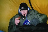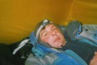 Po večeři, kterou dojídáme po pěti minutách už téměř studenou, ještě připravujeme do stanu zásobu teplého čaje. Se setměním už ležíme zahrabaní ve spacácích. Čelovkou si svítíme na plechovku piva a posloucháme zprávy, občas německé, z malé krystalky zavěšené ze stropní síťky. Vítr bubnuje zmrzlým sněhem na náš příbytek, teplota venku klesá na -14°C. Uvnitř máme „příjemnějších“ zatím mínus deset. Po několika „prokecaných“ hodinách s pocitem pohody usínáme...