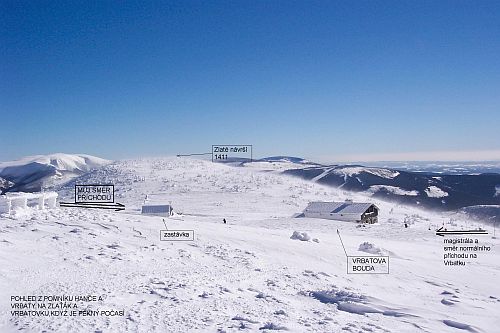 Idylka až po odbočku na zlaté Návrší. Po rozhovoru s dvěma němcema (řekl jsem jim, že to maj tak 500 metrů,a že se sejdem na Vrbatce a dáme čaj tak za 5 minut,že si odskočím tady do mlhy pro jeden vrchol. Namířil jsem to diretisimou přímo na vrchol (1411), to jsem ještě nevěděl, že se trošku zdržím. Na zlatém návrší nebo na místě, který jsem za něj považoval jsem napsal čas 12,10. Vtom zesílila vichřice,mlha – dohlednost 5 metrů,na plochým vrcholu jsem ztratil orientaci. Říkám si,stačí se vrátit tou samou cestou zpět,hlavně nejít po lavinovým severním svahu. Ale ejhle,jdu asi 5 minut z kopce. Vítr mě bičoval, a napovídal, že jsem asi na druhý straně svahu – neboli lavinové svahy Labské jámy. A to jsem sakra nechtěl. Říkám si že tu něco nehraje, kurva proč jsem si nevzal kompas, ten by mě zachránil. Další: „to není kurva dobrý.“ Už jsem začínal mít skoro paniku, furt jsem ale věřil, že jsem na zdravý straně hory. Když tu se dohlednost zlepšila asi na 10 metrů a mně se zježí srst na těle. Pode mnou padák jako sviňa, kdybych uklouzl …,plochý vrchol totiž pokrýval vyfoukaný led (v tuto chvíli jsem padal snad každou minutu – sněžnice na tyto podmínky prostě nebyly dělaný,a tak jsem používal hůlky jako cepín, abych zachytil pád po skluzavce). Další možností jak spadnout na zem bylo se pořádně narovnat, foukal tu opravdu silný vítr. Dohlednost se zase zhoršila a tak jdu traverzem doleva.( V tuto chvíli už jsem tušil,že jsem na špatný straně,doleva byl směr na Vrbatovu boudu). Po chvíli 2 metry přede mnou Jáma, připomínající díru do pekla, nic mě snad tak v životě nevystrašilo. Otočil jsem se do kopce,vítr v zádech a skoro jsem běžel jak o život. Připomínám, že jsem už víc jak 10 minut nevěděl, kde jsem. Když jsem doběhl na hřeben (je tak plochý,že při nulové dohlednosti jsem jen tušil, že to je už hřeben), zastavil jsem se. Začal jsem přemýšlet, jak z toho,o klidu se mluvit nedalo. Nebyla dobrá dohlednost taky z toho důvodu, že mě přimrzly víčka pravého oka, musel jsem je rukou roztrhnout,ale za chvilku zase přimrzly. První, co jsem chtěl řešit bylo chránit obličej proti větru, pro tyto případy jsem měl s sebou lyžařský brýle. Vyndal je z batohu a nasadil. Musel jsem se smát, protože jsem neviděl vůbec nic, byly totálně namrzlý. Tak jsem sundal rukavici a klekl na ni, aby mi ji vítr nevzal.Začal jsem námrazu kapesníkem sundávat. Tohle mělo jediný efekt: namrzla mě fest ruka. Brýle jsem zase schoval a přemýšlel jak určit správný směr. Naivně jsem zapíchnul hůlku do sněhu a hledal stín, jako že určím směr podle slunce a času,marně – v mlze je světlo rozptýlený dokonale, takže věci nevrhaj stín. Napadlo mě taky se nějak schovat před větrem, kopat záhrab do ledu sněžnicemi opravdu nešlo a tak jsem pokračoval ve směru ,který mně přišel nejlepší. Abych nebloudil v kruhu, tak při zastávce jsem si položil hůlky do směru, kterým jsem předtím šel. Jestli někoho správně napadlo, že jsem se měl vrátit po stopách zpět na cestu, tak věřte,že to nešlo. Dokonce  to bylo to první, co mě tehdy napadlo. Ale led a vítr byly proti, dokonce stopy 5 metrů zamnou už vlastně nebyly. Pokračuji tedy v nějakém směru, hlavně nesejít do Labských jam. Jdu asi 5 minut a nevěřím svým očím. Místo toho abych se vrátil zpět na magistrálu, kde jsem se loučil s němcema, jsem skoro hlavou v předklonu narazil do nějakého černého stínu,jdu blíž a už vím že je to v suchu,je to nějaká chata. Jdu ještě blíž a říkám kurva, co to je za chatu. Vrbatka přeci vypadá jinak, kde to kurva jsem? Ale už jsem byl v klidu, to by byl luxus bivak, sice bych si nenavařil, protože jsem mel všechno, jen ne sirky, ale spacák by byl luxus. Chata byla na první pohled opuštěná a zasypaná až ke střeše. V čele střechy byl zamrzlý nápis. Začnu jej jak řepa hůlkou obouchávat, v domnění, že tam bude napsáno Vrbatka. Nápis by byl normálně ve 3 metrech, já k němu došel po závěji, zaklekl a vybouchal. Musel jsem se opět smát, byl to velký reklamní nápis Budvar. Tak to néé, začnu chatu obcházet. Dohlednost se mezitím zlepšila tak na 30 m, v dálce vidím stín další chaty – Vrbatky. Už konečně. Ta 1. chata byla nějaká zastávka. Teď v klidu dojídám zelnou polívku na Vrbatce,dopíjím čaj a rozmrzám.Zbytek přechodu vzdávám, to by byla sebevražda, teď se ještě stavím na pomníku Hanče a Vrbaty, jaká náhoda, docela jsem na ně  při bloudění vzpomněl. Pak tak 3,5 hodiny zpět do Vítkovic.