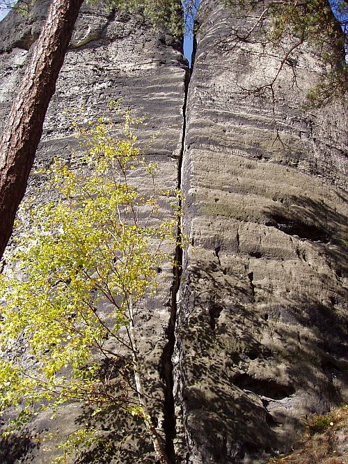 Naopak škudlina na druhé straně věže pod slaněním  Nordriss VI (od autora jižní spáry v tomtéž roce) se tváří velice odpudivě, ale pokud jednou za rok oschne, tak je to fakt docela pěkných třicet metrů technického nakulování kolem spáry. Na jištění tu vyrostl kruh, hodiny a strom. Kus nad stromem je taková nepříjemná širočina s trochou dřiny, ale najdou se tam dirky ku pomoci. Překvapivě příjemná šestička.