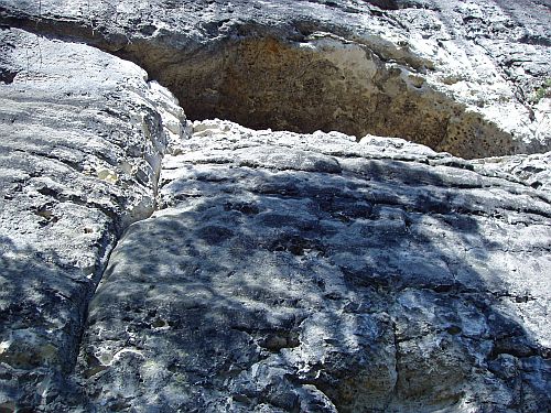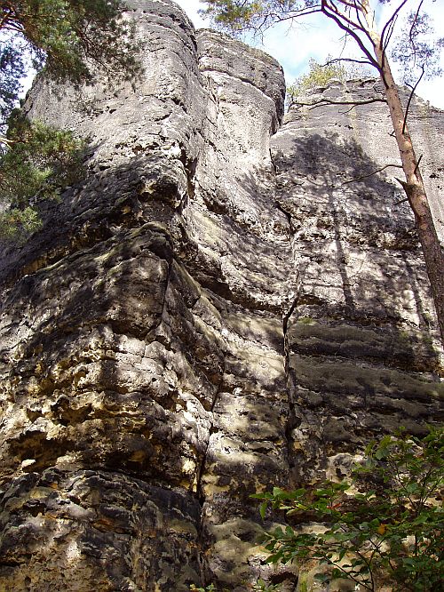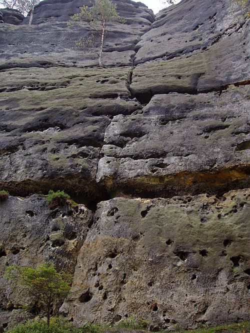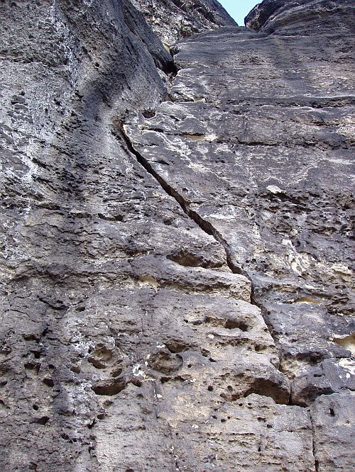 Totéž se už nedá říct o sousední cestě Südwestwand VIIb (1968, Jürgen Rössler), která se sice tváří přívětivě, ale…no zkuste a uvidíte. Nástup je kousek vlevo od spáry, vlníme se stěnou doleva až ke hraně, nebo kudy nás to pustí, ke kruhu. Od něj ještě kousek stěnou, do takové divné dolezové spárky a je to v kapse. Hvězda chybí a asi to tak má i být.