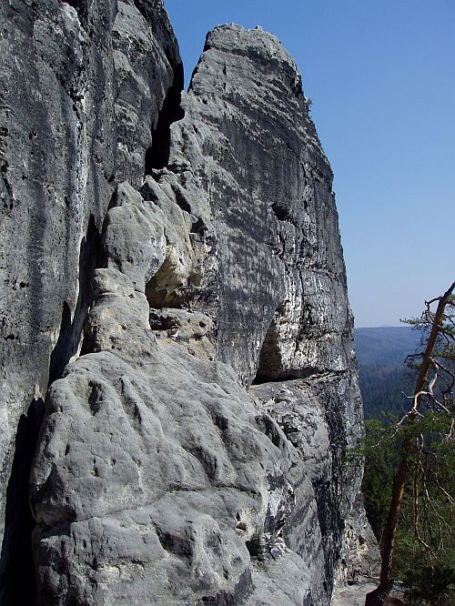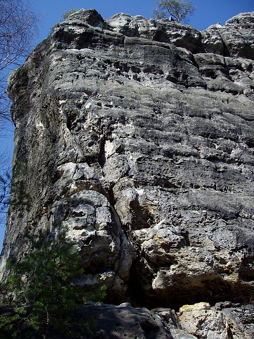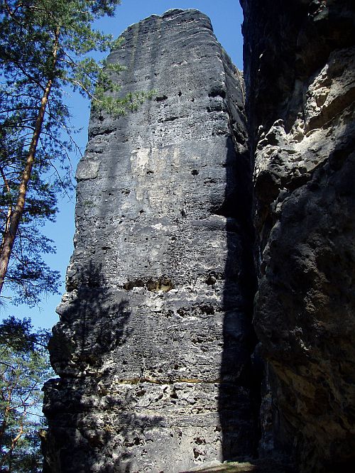 První cestu na tento „viklan“ se odvážili vytyčit již roku 1910 pánové Franz Gnass a Arthur Hoyer. Cesta Alter Weg V sice není nic moc, ale na vršku si užijeme. Čehože to? Strachu! Již jen se naklonit pro vrcholovou krabici je odvážný čin hodný senátora Terminátora, neboť ta vytoužená krabička je na kraji věže, přímo nad jejím nepodepřeným (až na ten klacík…) místem. Další kaskadérský kousek je slanění. Při představě, že se musím vyklonit a tím narušit rovnováhu nestabilní věže, jsem se docela zpotil…brr! Nic moc pocit, to raději 40 metrů ke kruhu bez smyček! Možná to s vámi nic neudělá, ale já jsem si asi týden před tím prohlížel fotky z relativně čerstvého výlomu na ráthenským Wartturmu (v roce 2000 se třetina věže  odporoučela do doliny i s kruhama) a tak ta psýcha, mrška, si se mnou trošinku pohrávala.