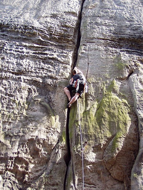Taky mě spáry moc nelákaly, ale je fakt, že umět je aspoň trochu lézt se může hodit. Ono lézt nějako cestu a znechutit si ji jenom kvůli tomu, že tam je pár metrů spáry, je docela škoda. Lano za nohou je na prd, ale v týhle cestě jsem fakt šel hlavou kvůli tomu, že mi tam zůstali nohy. Nebo má někdo návod na to jak vyskočit nohama ze spáry?