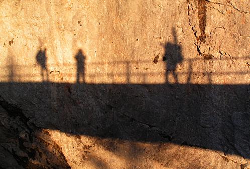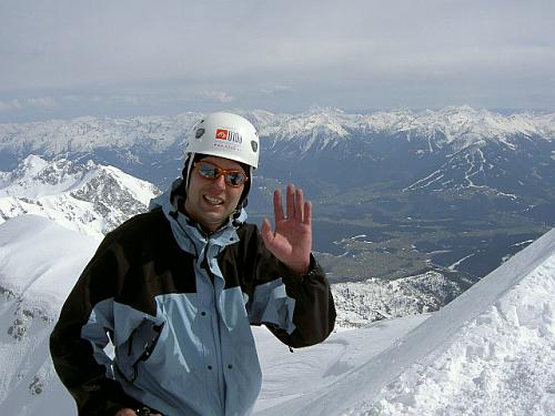 Vrchol Hohe Dachsteinu se pomaličku přibližuje. Zbývá poslední úsek po ledovci pod stěnu. Teď už si nadávám bez zábran. Nohy, plíce, srdce – každá část těla mi říká, že by jí doma bylo líp. Najednou jsem pod stěnou. Džast s Milanem už sundali lyže, navlíkli si sedáky, mačky a chystají se nahoru. Únava ze mě padá, přece to nevzdám nějakejch mizernejch sto metrů pod vrcholem. Ačkoliv lezení v zimě zrovna nemusím, jdeme do toho s Kubajzem taky. Nahoru vede cesta zajištěná fixním lanem a spoustou železa. Za chvíli je tu vrchol (2995 m.n.m.) a typický kříž a taky báječný rozhled a báječný pocit.