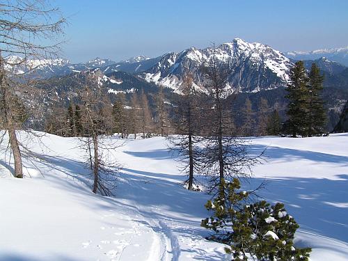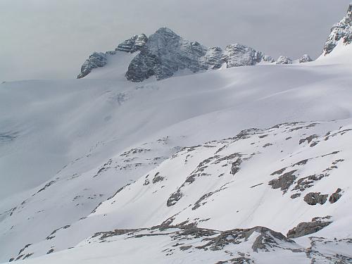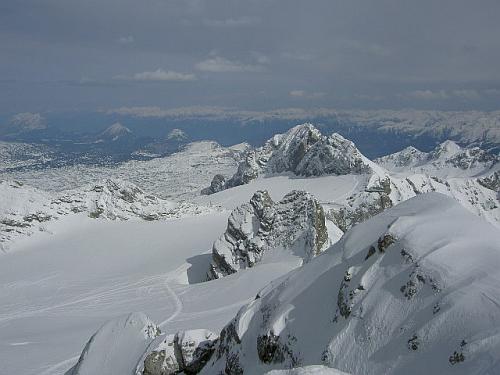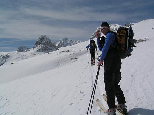 Zase je to do kopce. Zaplať pánbůh, každý metr dolů musíme znovu vyšlápnout. Zhruba za hodinu vidíme nalevo od nás zavřenou chatu. My však míříme k rolbou projeté trase vzhůru na ledovec. V průvodci jsme se dočetli, že je tu jeden z nejdelších alpských sjezdů. Ze sedla vedle Dachsteinu, kam vedou lanovky ze severní strany, až na Krippenstein a dolů do Obertraunu. Urolbovaná cesta nám šetří síly i čas. Jednak slunce už dávno rozehřálo zmrzlý sníh na firnovou kaši a také máme pocit bezpečí. Kudy projela přes ledovec rolba, projdeme snad bez úhony i my. Trhliny však nejsou vidět ani nikde kolem, sněhu je pořád ještě dost.