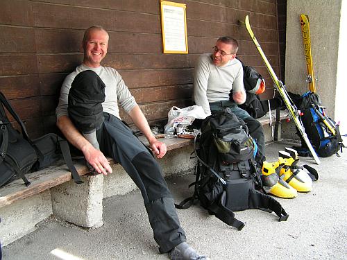 Ani se mi nezdálo, že bych stihnul usnout, když jsem uslyšel Džastovo:"Kubajz, budíček!" Bylo jasné, že se to netýká jenom Kubajze, ale taky Milana a mě. Džast si nastavil budík na poctivých tři čtvrtě na pět. Vyklepali jsme se ze spacáků a začali balit. Neměl jsem v tu chvíli pocit, že bych mohl dojít dál než na konec parkoviště. Pomalu svítá a je docela kosa. Zhruba v šest vyrážíme s lyžemi na batozích na cestu.