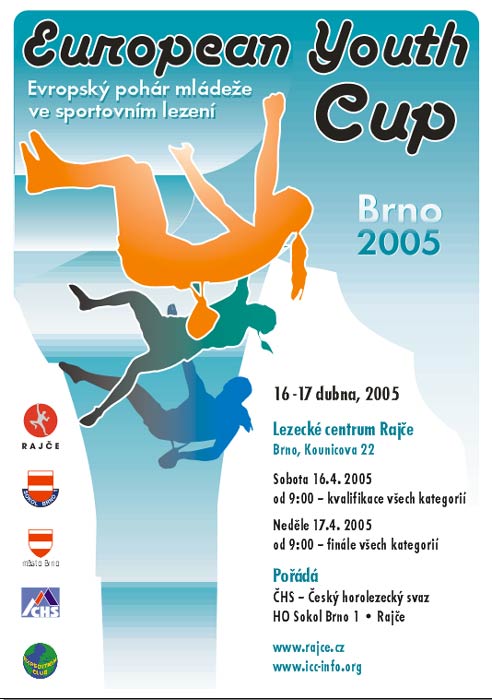 Tímto všechny zveme na Evropský juniorský pohár v Brně na Rajčeti dne 16.-17. 4. 2005. Přijďte povzbudit naše závodníky v boji s evropskou juniorskou špičkou. Zejména naším želizkům v ohni. Silvě Rajfové a Martinu Stráníkovi. Přihlášena je i rakouská neděje David Lama. Děkujeme Lezci.cz za mediální podporu.