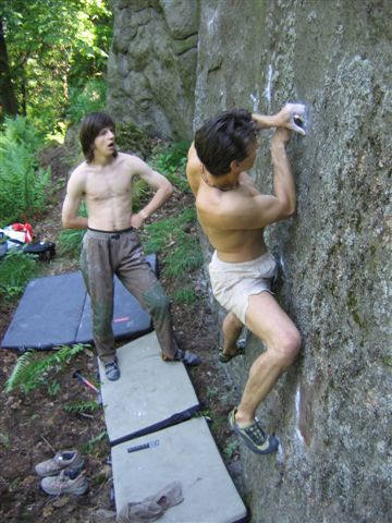 A jak by tedy měl definitivně vypadat vlastní závod? Doufám, že se prezentace moc nenatáhne přes desátou hodinu a proto na ní bude makat co nejvíc lidí, abychom se na návsi moc nezdržovali. V lese to všichni společně obejdeme – ale bude to fakt mega přehledné – a doufám, že kolem půl dvanácté zazní startovní výstřel. V šest to odpískáme a začne účtování. Tedy pro jednoho již dříve, totiž pro prvního, kdo vyleze jeden z nejkrásnějších boulderů na světě – Kometu za 7C. Tento šťastlivec si z vrcholu vyzvedne jistě velmi snadno pitelnou záležitost (fronty nebudou). Ostatním se bude po šesté hodině počítat. V hlavní soutěži deset nejtěžších boulderů, kromě toho bude mezi kluky i holkami vyhlášen/a závodník/ice s nejvíce přelezenými bouldery (nerozhoduje obtížnost).
