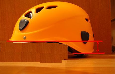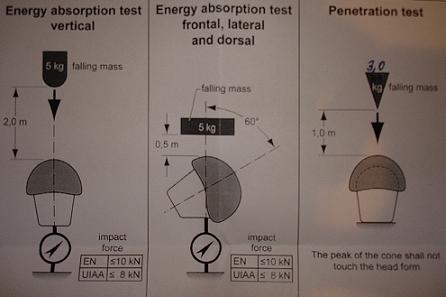 1. Schopnost tlumení energie svislého nárazu při zkoušce dle 5.5 při výšce pádu 2 metry a při nárazu polokulového rázníku (beranidlo) podle 5.5.3.3 nesmí síla přenesená na maketu hlavy přesáhnout 10 kN. Dle normy UIAA 8 kN. (na obrázku je bod nárazu pod č. 2)