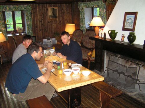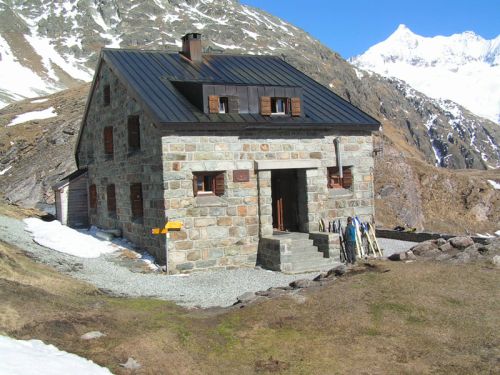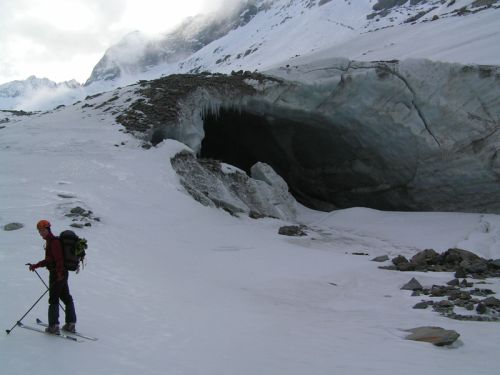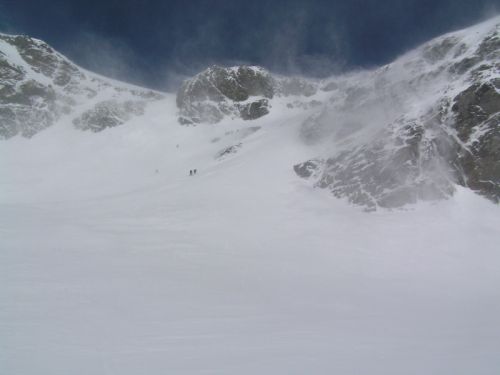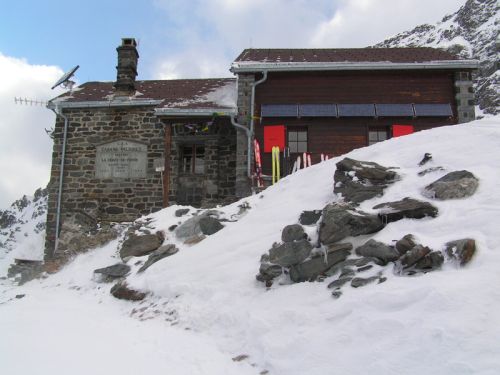 Souvislý sníh začíná někde kolem 2300 m.n.m., ale občas je nutné lyže sundat a přenést přes holá místa. Počasí, které bylo ráno krásné, se během dne kazí a závěrečný výšvih k chatě stoupáme za sílícího větru a při mírném sněžení. Chata není zezdola vidět a i když je v průvodci popsáno několik způsobů, jak se k ní dostat i za nepříznivého počasí, jsme rádi, že je prošlapaná stopa. Na chatu před námi dorazila skupina Francouzů s profesionálním průvodcem.