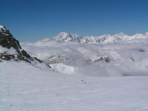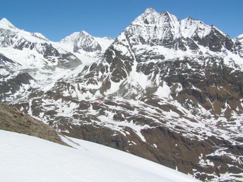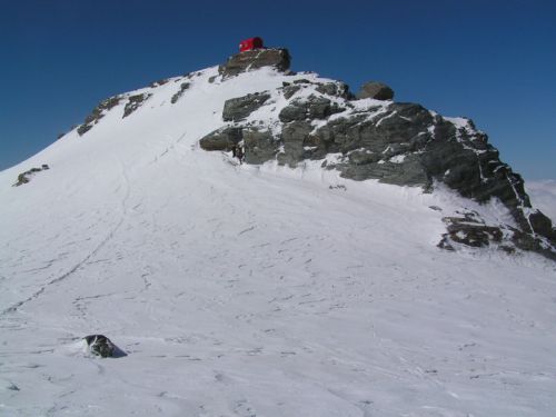 Ráno vstáváme ještě za tmy, ale za chvíli se rozednívá a je vidět, že v noci se čerti ženili. Napadlo pár centimetrů nového sněhu a vítr ho pěkně nafoukal. Trošku vypočítavě dáváme přednost profesionálně vedené výpravě. Bohužel jsme je brzo předběhli, protože jedna její členka vzdává další postup a vrací se i s vůdcem zpět na chatu a odtud vrtulníkem dolů. Švýcarský servis. Ostatní čekají na vůdce.