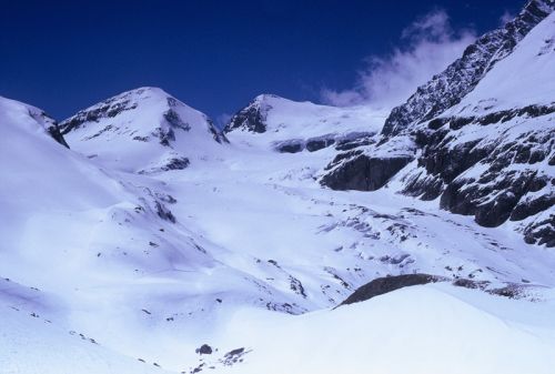 Stoupáme na lyžích ve stopě nějakých rychlých Švýcarů, kteří vypadají, že to tu dobře znají. Jak kopec nabývá na strmosti, jde to v sypkém sněhu čím dál hůř. Navíc jsme si nesměli vzít lyže na noc do chaty a na promrzlých skluznicích pásy špatně drží. Jde to pomalu a za chvíli mě to přestává bavit. Sundávám lyže a jdu do maček. Brzo se ukázalo, že tentokrát jsme na stopu neměli štěstí. Chlapci nás zavedli rovnou do míst, kde to dnes smrdí lavinou. Opatrně traverzujeme čerstvým sněhem a přitom se snažíme být rychlejší než slunce, které se objevilo na obloze a postupně ozařuje svah svými paprsky. Konečně sedlo. Fouká silný vítr, ale mraky už jsou pryč.