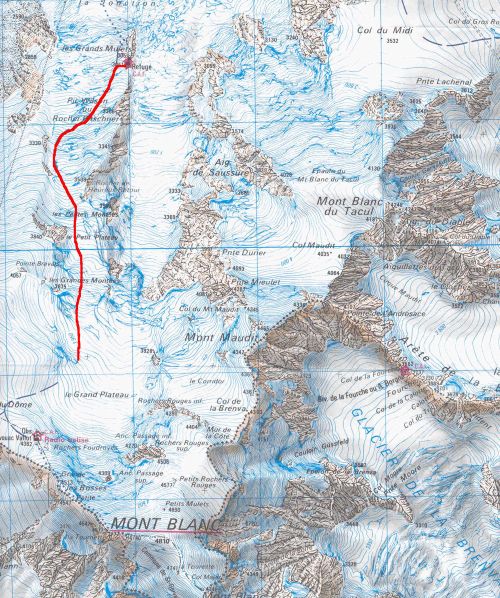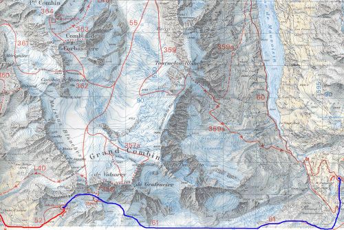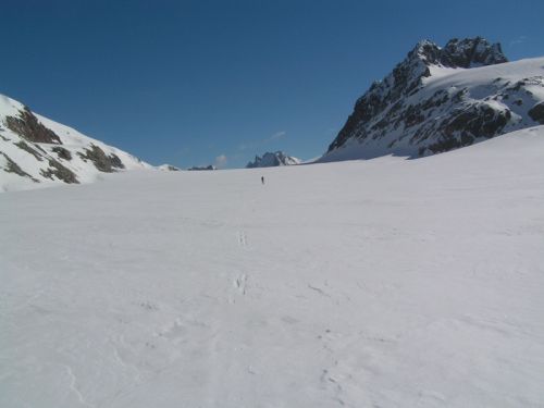 Otemma je ukázkový ledovec bez trhlin a s velmi mírným stoupáním až do 3050 m.n.m. Žádné šněrování, jdeme hezky přímo. Jenže jdeme a jdeme a připadá nám to jako bychom stáli na místě. Stále stejné skály napravo i nalevo a stejný je i horizont. Jako bychom šli po "zemeguli" trefil to Drahoš. Sluníčko to do nás pere a na ledovci je zatraceně horko. Následuje orientačně trošku náročný závěr k chatě, která, jako obvykle, není do poslední chvíle vidět.