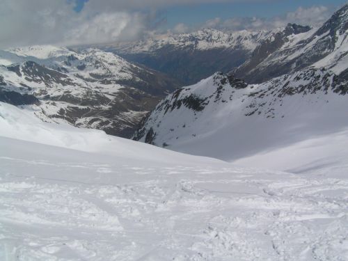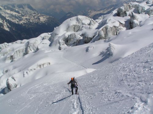 Chata Vignettes stojí přilepena ke skále na ostrém hřebínku. Škoda, je tu krásně, ale my musíme sjet po Glacier de Piece do Arolly. Sjezd však stojí za to. Přímo od chaty z 3160 m.n.m. sjíždíme až do 2000 m.n.m. Závěrečná část vede po sjezdovce, která je už sice mimo provoz, ale po zbytcích sněhu dojíždíme až dolů k silnici. Sundáváme lyže a hle, první auto, které se objevilo, je to naše i s vysmátým Malachem, kterému je už dobře.