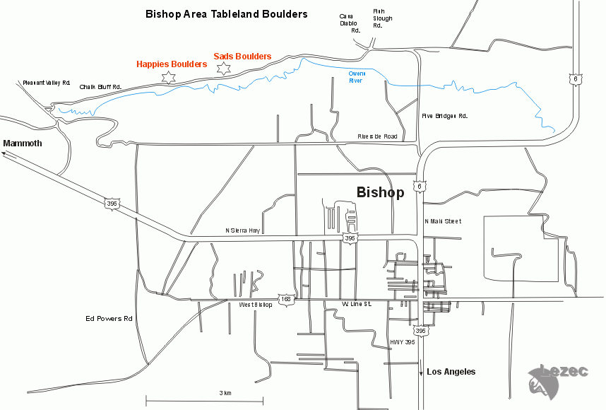 V údolí nad Bishopem, kde se schází slunce-milní boulderisti, se kdysi na dně údolí usadil sopečný tuf v mocných deskách. Do něj se vymlela sem tam koryta až kaňony, dvě nejvýznamnější se jmenují Happy a Sad Boulders. (Zkráceně jim říkají také Happies a Sads).  Deska se na kraji těchto koryt vlastní vahou rozlámala a lomové balvany se skutálely do takto vzniklého údolíčka.