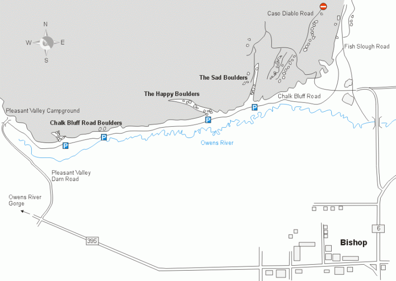 Cesta do Sads a Happies je celkem jednoduchá pokud jedete jako my ze severu, stačí ještě než vjedete do Bishopu odbočit doleva na prašnou Chalk Bluff Road . Která vede podél řeky pod zlomovým valem. Jedete dlouho možná tak 2 km. Určitě nezabloudíte, není kam odbočit a zastavíte na takovém prašném parkovišti, kde už asi budou nějaký auta. Taky parkoviště dokážete identifikovat podle informační tabule.