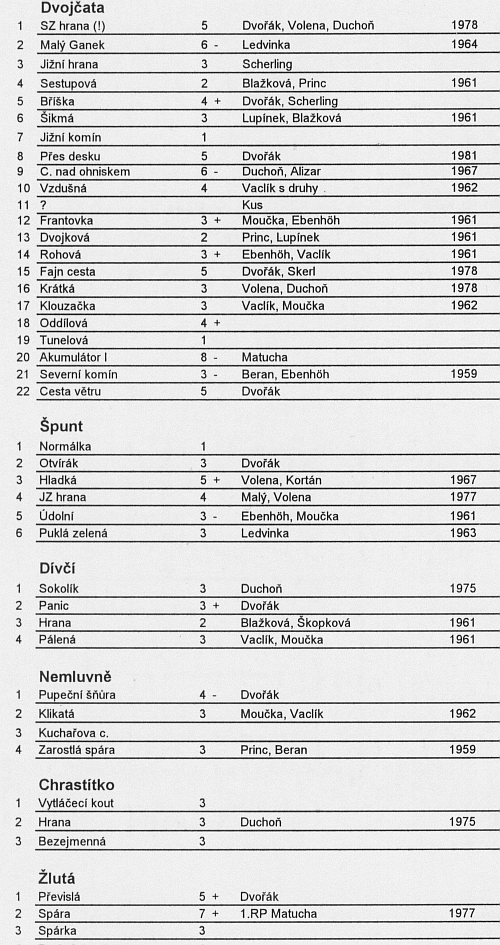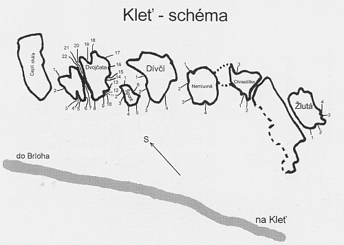 proto posílám část průvodce, který vytvořil Honza Mára. Doufám že se neurazí. Jedná se o oblast Kleť, což je velice známý kopec v okolí Českého Krumlova, v CHKO Blanský les. Přístup je možný ze železniční stanice Č.Krumlov, poté kolem kasáren do Vyšného a odtud po modré značce okolo Modrého obrazu na vrchol Kletě cca. 5km. Z vrcholu okolo televizního vysílače a po 50m po pravé straně jsou z cesty vidět skály (ehm skalky). Další možnost je: nechat se vyvézt lanovkou na vrchol, lanovka vede z opačné strany kopce z obce Holubov, u lanovky je možno parkovat. Na vrcholu je rozhledna, hvězdárna, hospoda a za dobré viditelnosti krásný výhled na Alpy. Skalky jsou 4-6m vysoké, a proto není nutné lano, i když jsou některé cesty osazeny jištěním, je to oblast spíše na 1 den (podle výkonnosti) je zde možno velmi dobře bulderovat. Je tu možnost dalších ještě stále neobjevených linií.