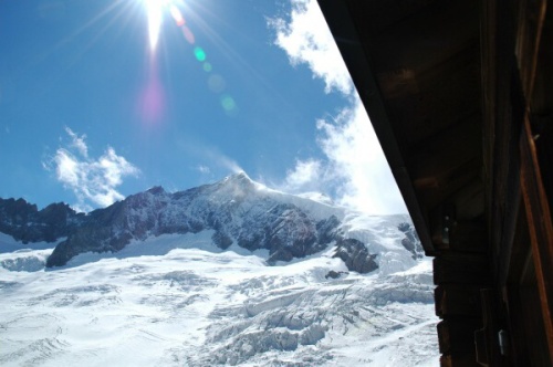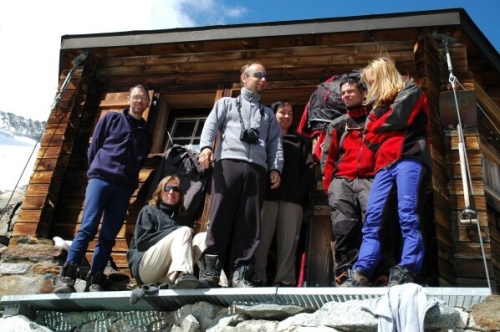 Po cestičce směřující k Marjelesee, která nás dovedla blíže k ledovci. V půli cesty jsme odbočili, sestoupili k ledu a po navlečení do sedáků jsme vyrazili. Přímo na druhou stranu do údolí ledovce Mittlealetschgletscher. Už zde jsme byli šíleně vysílení, celonoční cesta a ledovec nás dostal. To náš ještě čekalo 800m převýšení a asi 5km pochodu k Mittlealetsch bivouacu, který leží ve výšce 3013 m.n.m., kdybychom poslechli průvodce a šli středem ledovce, šlo by to možná jako po másle, my ale lezli po suťovisku, a tak po 4 hodinách, co jsme dorazili na chatu, jsme byli uplně bez energie, bez možnosti jakéhokoliv dalšího pohybu. Jedině postel a deky nás zachránily.