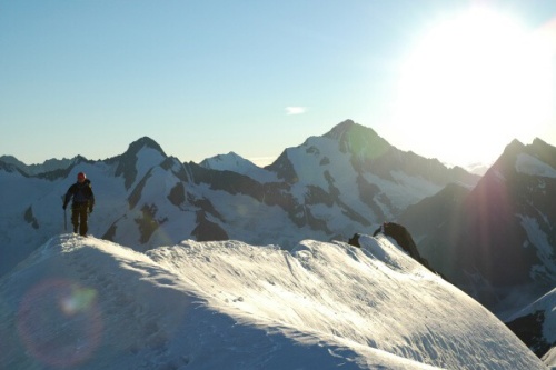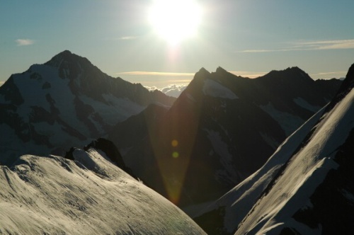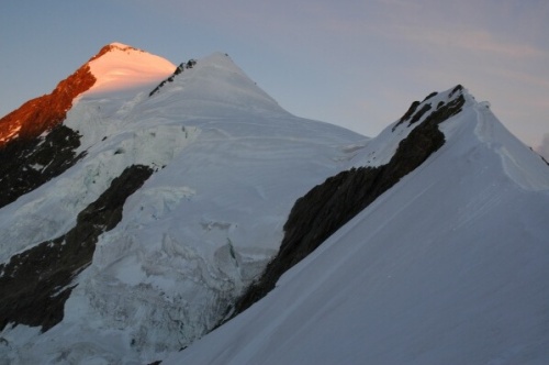 Další den jsme měli budíčka na 3h ráno. Ve 4 jsme vyráželi z chaty a s čelovkama nastoupili na ledovec, který stoupal až do sedla Aletschjoch (3629 m.n.m.). V sedle jsme byli akorát včas, svítalo a okolní hory byly vidět v krásném světle.