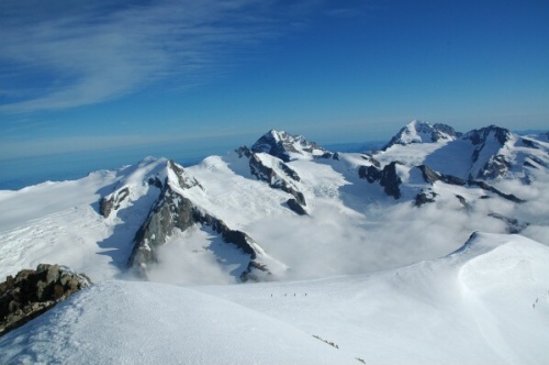Sestup byl horší, protože sníh začal tát a my se brodili ve sněhu. Nejhorší byl sestup ze sedla na chatu. Každý si i zkusil, jaké to je zahučet do trhliny, protože sněhové mosty už nedržely jako ráno, ale vzhledem k tomu, že jsme dodržovali všechny zásady chůze po ledovci, se nikomu nic nestalo a my jsme byli okolo jedné odpoledne zpět v bivaku a čekal nás zasloužený odpočinek. Vrcholový den se povedl parádně.