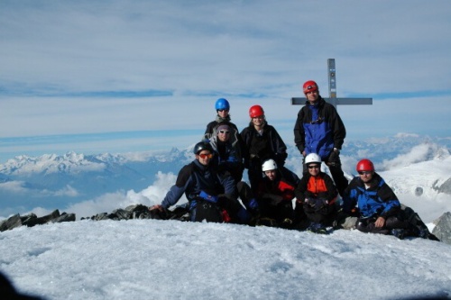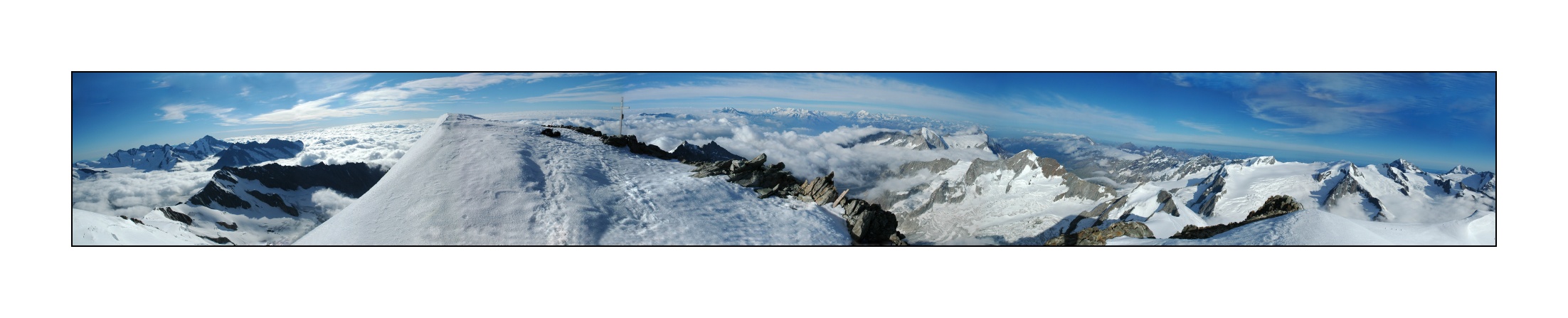 Ze sedla to už byla "brnkačka". Po hřebínku na další sněhové plato, přes něj na další hřebínek a na vrchol přes žebro I UIAA na vrchol velice krásné hory. V 8 ráno, tedy po čtyřech hodinách a o 1,5 hodiny dříve, než udává průvodce, jsem stál na vrcholu. Další chodili po minutkách za mnou a za nedlouho jsme byli na vrcholu všichni. Počasí vyšlo. Parádní výhled od Finsteraarhornu, přes Eiger, Mönch, Jungfrau dále Mont Blank, Matterhorn, Fiskamp, Monte Rosa a všechny hory v okolí.