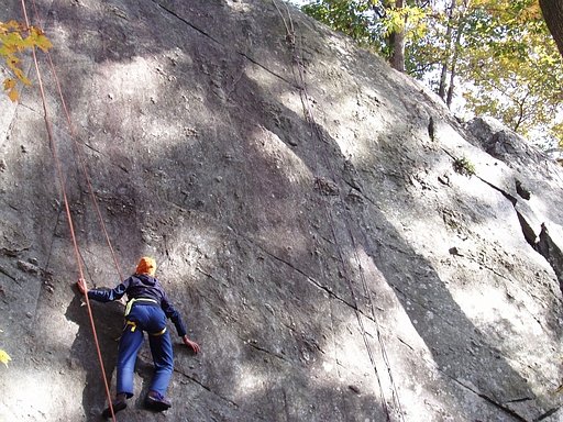 V okolí Washingtonu, DC, je řada skal, na kterých se leze výhradně stylem TR. Dívčina v cestě The Flake 5.9+, Carderock, Great Falls, Maryland