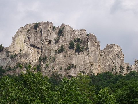 Shawangunks, New York: pohled na část několikamílové zdi Trapps z GT Ledge, což je dlouhatánská police, která stěnu protíná zhruba v polovině a obvykle slouží ke štandování.