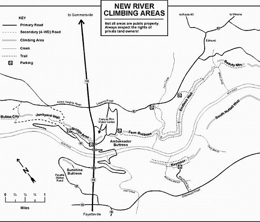 Útesy jsou členěny následovně: po pravé straně ve směru proudu New River jsou to oblasti The Beauty Mountain, těžce převislé stropy The Cirque, 4 míle (!) dlouhá zeď s odpovídajícím názvem Endless Wall, za mostem pak Bridge Area, Junkyard a konečně Bubba City. Po levé straně jsou to oblasti South Nuttall Wall, Kaymoor a Sunshine Buttress. Stranou od The New River Gorge se nachází populární skály lemující břehy přehradního jezera Summersville Lake a několik dalších minioblastí.