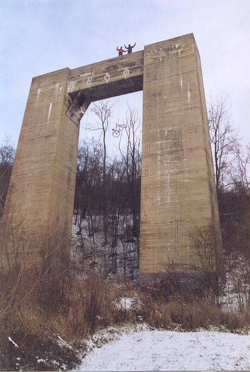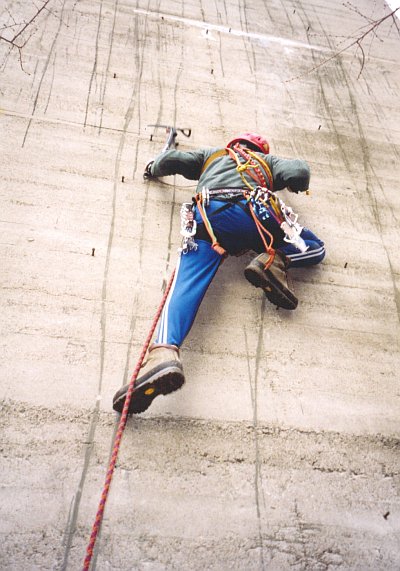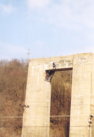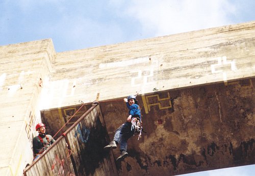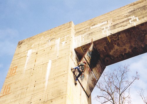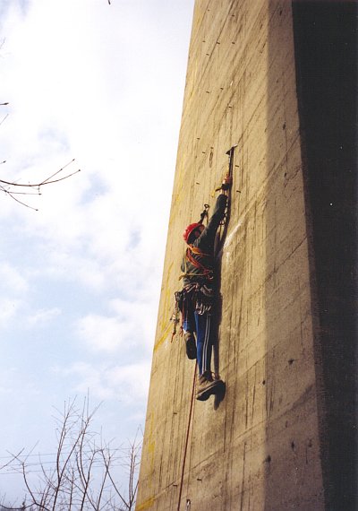 Sraz v 8 ráno před FASTem". Více neprozradil. Nepomohlo žadonění ani výhružky. Jura střežil svůj výmysl lépe než Jan Tleskač. Usnesli jsme se na místo setkání dorazit, ovšem s tou podmínkou, že pokud se bude jednat o nějakou blbost, dáme mu do držky za brzké vstávání a zameškanou school. Ráno na sraz dorazil organizátor klasicky poslední. Aniž by definoval cíl mise, pouze se suše dotázal zdali jsme přibalili hamaky. Nasedáme na šulinu a valíme na prígl. Začínáme tušit. Ocitáme se na hrázi přehrady. Jestli měl v plánu vylézt hráz máme smůlu, zatopili nám cestu. Jura máchne rukou do levého svahu údolí Svratky: "Hle toť on" Přiznám se - tušili jsme to. Mostní pilíř plánované, ale nerealizované Hitlerovi dálnice. Akce s krycím názvem "Hajltůling" může začít. Prohlížíme možné výstupové trasy a hned je nám jasné na co cepíny. Na betonovém masivu je množství šroubů, na kterých byly dříve chyty (pilíř sloužíval jako stěna). Trasa vybraná a kdo jiný než plně vyzbrojený Jura se ujímá vedení. Jistí se co 2m v nýtech. Šlo by to i častěji obhozením šroubu drátkem vklíňáku, ale bylo by to zbytečně vyčerpávající. I tak je to záhul na ruce dost velkej a Jura hojně využívá nýty k odpočinku. Díky značení výšky přesně víme v kolika se nachází metrech. V 17metru začíná převis (dřevěná deska přimontovaná do vinglu). Zajímavý krok, chňapnout desku na efektivního sokolíka, přehoupnout se do "hnízda" ve vinglu a je vyhráno. Jura buduje důmyslný štand. Druhá délka bude na Vaškovi. Jura mu spouští naše dvě drajtůlingové zbraně (cepíny choďáky). Vybuší do hnízda a de na věc. Zkouší to direkt z vinglu přímo hore decentním koutkem, ale nejde to (i když ostřílenější praktik technického lezení by si nejspíš poradil). Vašek volí hezčí, ale také vzdušnější variantu výstupu a to traverz po hraně stropu překladu doprostřed a odtud nahoru (tato volba skýtá nejen více kovových chytů, ale také pěknou expozici s 20 metry ničeho pod sebou a 3 metry překladu nad sebou). Z hráze nás pozorují dalekohledem muž a žena zákona. A sakra. Naštěstí je policajt Pájův kámoš a policistka pohodářka, takže je vše OK. Přijíždí se podívat přímo pod pilíř. Policistka lituje že je ve služebním, jinak by prý určitě zalezla s náma. Chvíli s ní žertujeme. Vašek mezitím dobil vrchol. Pája Skynhýt a Alík odchází. Páju by neunesl namožený prst a Alík neunesl výčitky svědomí ze zameškané školy a odešel studovat. Kluci mi spustí prodloužené kovové ruce a hákuji po šroubcích nahoru. Je to výživné. Nahoře vrcholové foto a dolu slaňujem z erární smyce obhozené kolem čouhajícího prutu výztuže. Pro první 2 slaňující pojištěno smycí vlastní. Tož bolo to pekné a tudíž nemůžem dát Jurovi do držky. Nevadí snad někdy příště.