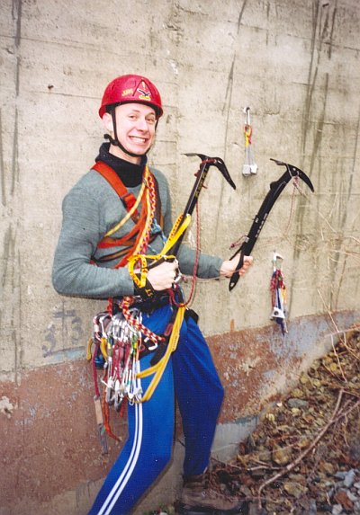 Jen si tak s úsměvem vzpomínám, jak jsem před spoustou let s kámošem z kasáren, kde jsem si plnil své dva roky lehké vazby, půjčil od elektrikářů nastřelovací pistoli, z pásků plechu silného asi jako z konzervy-vepřovky nastříhali a vyvrtali "nýty" a vzhůru na pilíř...! Levá hrana pravého pilíře, pozůstatky budou jistě ještě patrné..... Když šel nastřelovák jak do másla, zajel tam asi 10 mm. Ale to bylo asi třikrát, většinou tam hřebík držel jen za špičku... Pod vršek jsem přistřelil nalezené lyže a úplně strachy zes.... jsem dolezl na vrchol... J I Ž N I K D Y V Í C E !!!!!