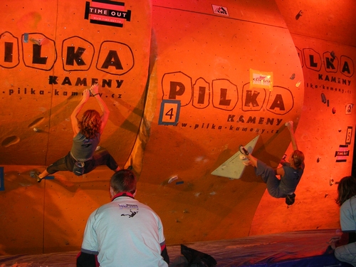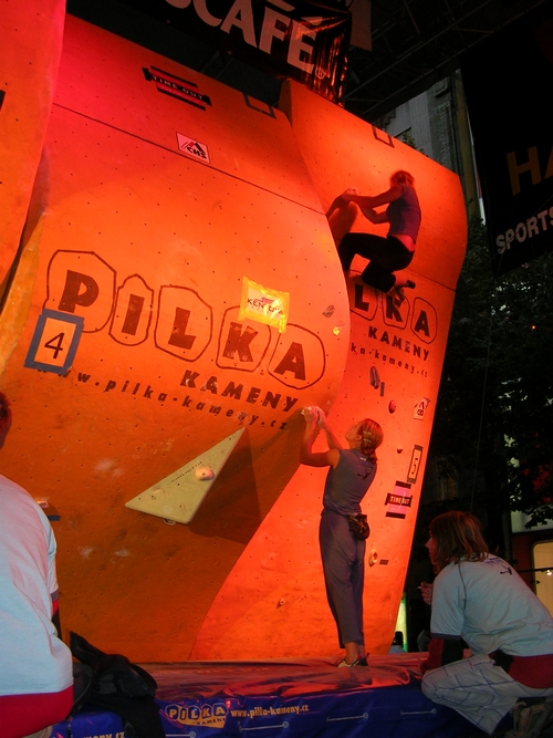 Do finále mezinárodního mistrovství České republiky v boulderingu dnes v Praze na Václaváku postoupilo 8 žen: Věra Kostruhová, Lenka Trnková, Míša Drlíková, Zuzka Čintalová, Nelly Kudrová, Silva Rajfová, Lucka Rajfová a Alena Zemanová. Finále žen začne v cca 18.30.