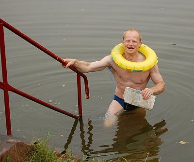 Kolem jedenácté start, to už mi naštěstí nezbývá než sledovat „nejdrsnější“ chlapíky a dívky v Čechách, jak zdolávají hýskovský jez, plavou asi 150 metrů, běží kilák na stanoviště, kde nafouknou čínskou matraci a s ní se opět vrhají do Berounky a „čochtají“ zpět na místo startu. Tady rychle do suchého a 50 km MTB. Po trase ještě zaběhnout do štoly, nastřílet ze vzduchovky, 6 km orientačního běhu, nějaké to lezení nebo běh s cihlami a … A čas vítěze? Směšných tři a půl hodiny. Rozdat ceny za třicet tisíc, naházet něco do auta (jsem si myslel, že si během dne trochu chrupnu - haha), stavit se pro Vencu a kolem sedmé navečer konečně PRYČ.