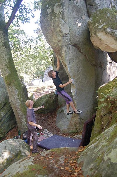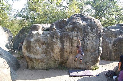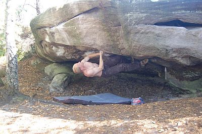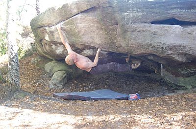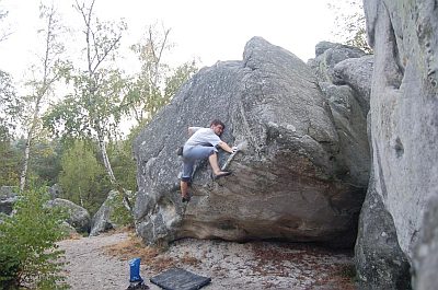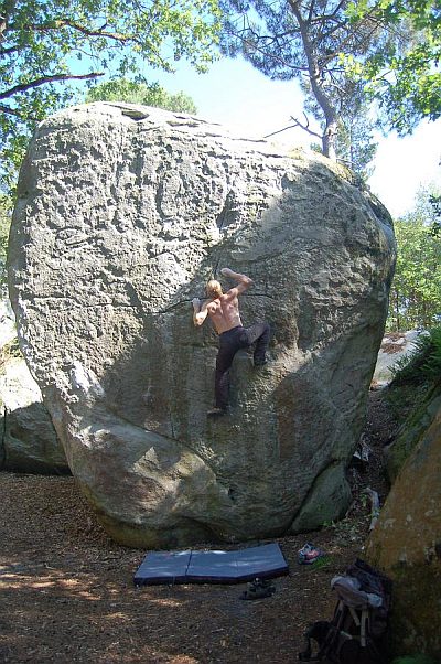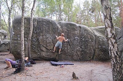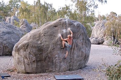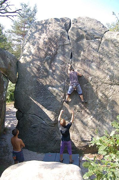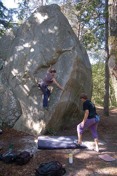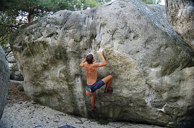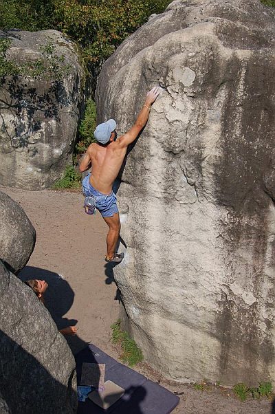 Odpoledne jsme se s Pavlem vydali do necelý kilometr vzdálené oblasti Manoury, což je takový kopeček posetý kameny, zase několik set boulderů, ačkoli zde už nejsou odskoky zcela rovné a bouldermatka není na škodu. Po cestě se jde ještě pod oblastí Dame Jouanne, ale ta mě moc nechytla. Je to celé takové ve svahu, divně poházené…