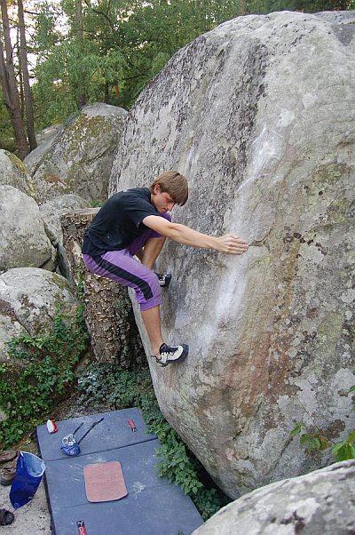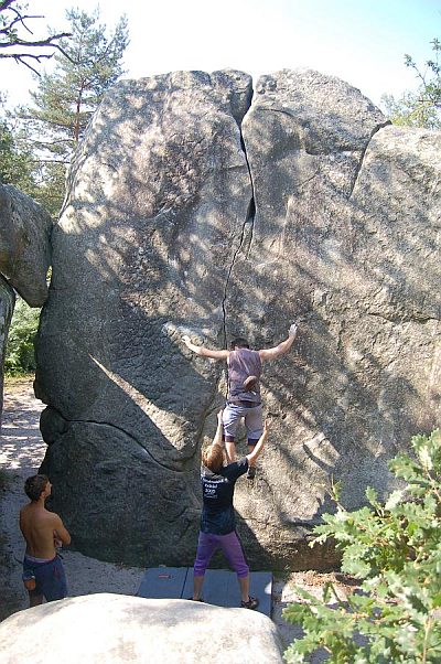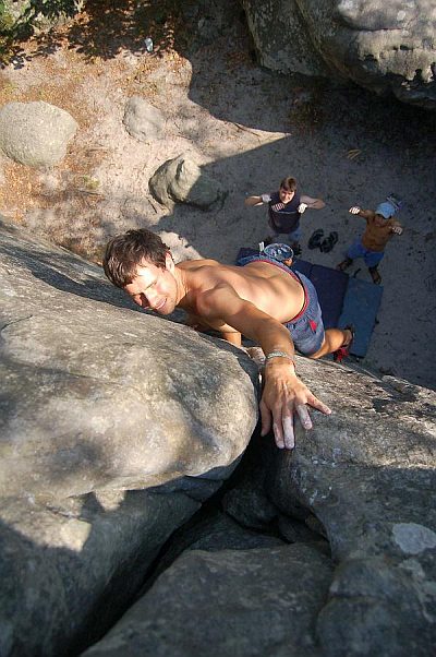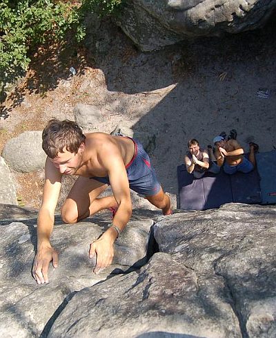 Však jsme si tu koupel zasloužili. Celý den jsme doslova drtili jeden boulder za druhým. Lezení je v Buthiers velmi pestré, od klasických bleauovských boulí a výlezů, přes nádherné hrany a výjimečné destičkovité lišty, připomínající přilepená sklíčka na zdi. Jsou tu plotny, kolmice i stropy. Jsou tu věci nízké i věci z nichž zeje šest skob. Lezli jsme skoro jenom v části „piscine“, která je poněkud stranou rekreačních středisek zbohatlých kapitalistů (ó my starší, jak často jsme slýchávali tyhle pojmy!).