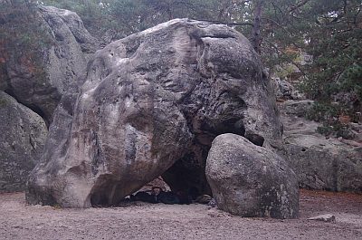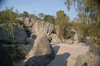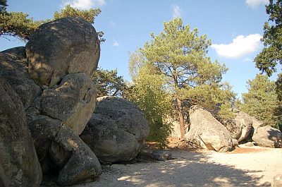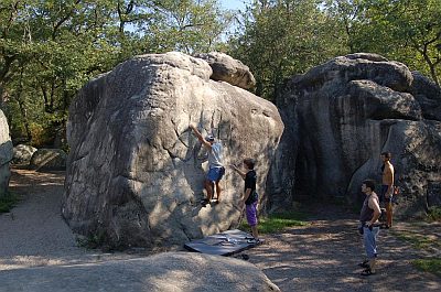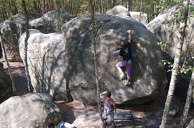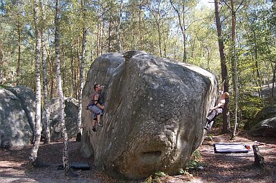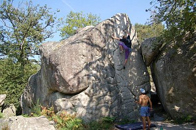 Jedna z nejjižnějších oblastí Fontainebleau není asi tak úplně Čechům známá, bude tedy jistě užitečné, blíže si jí popsat. Hned při vstupu do skal vás uvítá útvar, který dal celé oblasti jméno, asi osmimetrový skalní slon. Vy, kdož jste se rozhodli stejně jako tento rok my strávit pobyt ve Fontaineleau nadivoko (tedy nikoli v hotelu, kempu či u známé tetičky), pamatujte dobře, že pod břichem slona lze v pohodě přečkat déšť a, když už jsme u tohoto způsobu života a pobytu, za zmínku jistě stojí i ve Fontainebleu jinak jev poměrně vzácný, totiž pumpa s pitnou vodou na parkovišti. Vraťme se však do skal, kde se nám hned za „slonem“ rozprostře písčitá pláž, posetá kameny, které vpravo stoupají do kopce. Ideální oblast pro rodinky (což je v neděli odpoledne přece jenom dost znát), několik stovek boulderů je převážně lehčích obtížností (tedy 1 až 6C) a něco na doskoku potřebujete snad pouze kvůli očištění bot od písku, do kterého se tak nádherně padá. Hravé, milé, dost teplé, stín je tu vzácnost. Večer se oblast vylidňuje a my okoušíme chlad vody z pumpy a za bzučení komárů (není na škodu jít poněkud dál od zdroje vody) usínáme ztrápeni náročným víkendem.