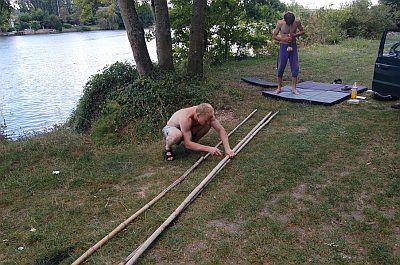 kdy tak nějak začal můj třetí výlet do mekky boulderingu, Fontainebleau. Ten den jsme zahájili s dalším aktérem zájezdu – Pavlem – s lany v rukou a cihlami v batohu na zádech. To byl nápad, vymyslet jako trestný okruh pro nelezecké účastníky Českého poháru v přírodních vícebojích, kterého jsem byl v ten den jakýmsi ředitelem, běh s cihlami v rukou. Tedy vyrvat cihly na skálu, rozvěsit lana a hurá do vody, postavit bójky na plaveckou část.