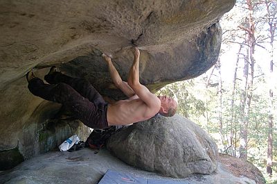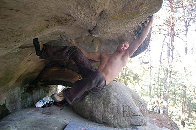Probouzíme se pod převisem, který je předurčen jako místo PADání 2006. Rychle na skálu zúročit síly a zkušenosti nabyté v daleké cizině. Je tu krásně, skoro stejně, jako tam, kam si alespoň jednou v roce jedeme pro srovnání. Je tu skoro stejně krásně jako tam, kde se psaly dějiny boulderingu, vždyť první 6A tam vzniklo mezi světovými válkami a 7A v roce 1953. Je tu skoro stejně krásně, jenom tu nejsou tak hezké dopady, je toho tu přece jenom míň a ty krystaly nechtějí přestat jebat. Je tu stejně krásně a bohužel tu i stejně tak začíná pršet…