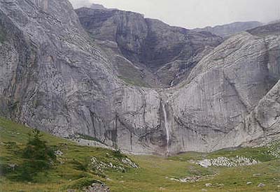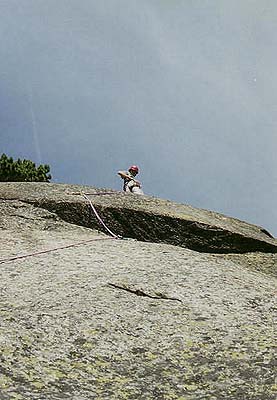 Když sjedeme do údolí prší, spaní volíme v kempu “Heiti” ve vesnici Gsteig (25 SF pro dvě osoby, stan a auto). Stan stavíme v přestávce deště. Ráno je příjemné, ideální na focení: hory, zelené louky, dynamická obloha, s bílými a tmavými, až černými mraky, které se shlukují okolo nejvyšších vrcholků. Škoda, že naším cílem není focení hor ale lezení po nich. Po nočním lijáku není ráno příliš kam spěchat, asfalt na silnicích schne pomalu a my se dostáváme pod skálu právě, když začíná osychat. Stěna je vysoká přibližně 160 m a nabízí více jak 30 cest, které jsou situovány v bezprostřední blízkosti mohutného vodopádu. Obtížnost je opět jako v Leysin, takže si na své přijdou jak extremisté, tak pohodáři. Bohužel se počasí kazí a od prvního nýtu mne vrací déšť. Nevadí, hodinový nástup byl příjemnou ranní procházkou, za niž se zpět v civilizaci odměňujeme dobrou kávou a jablkovým koláčem. Určitě se sem však ještě vrátíme.
