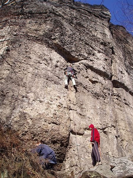 Začneme pěkně zprava. Nebudu jmenovat všechny cesty, některé ale doporučím. Neuer Südriss VIIb, spára bez kruhu s nejtěžším místem na nástupu, z velké části lezitelná i po chytech kolem spáry, hodí se několik smyček lanovic, horní polovina nejištěná. Krauterwand VIIc s variantou Magisteraufschwung VIIIa vede vlevo od předchozí cesty trhlinou ke kruhu nad převisem a doleva ke druhému, pak už přímo přes další dva kruhy na vrchol. Dolní polovina silové převislé lezení, nahoře rajbásky. Pěkná cesta.