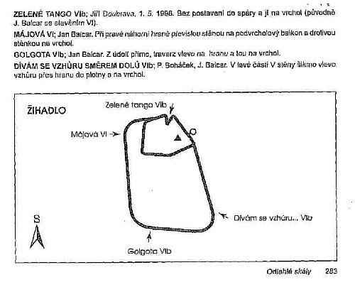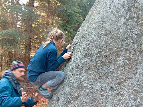 Konec sezóny se zase nedostavil, v neděli je nádherně, takže výběr padá na rodinný výlet do Jizerek s cílem vylézt na věžičku Žihadlo. Průvodce o ní praví: Krásná, velmi obtížně přístupná věžička… Ještě tak ze třiceti metrů si člověk říká co to v tom průvodci melou za nesmysly, takovej kamínek, ale zblízka je to jinak. Na výběr jsou 4 cesty a každá má svoje. Zatímco my dospěláci marně zkoušíme nastoupit do spárky za VIb, z druhé strany se po chvíli začínají ozývat divné poznámky… Rodičovské pudy přebijí starosti s nástupem a jak obejdu skalku vidím svoji desetiletou dcerku jak celkem v pohodě stojí metr pod vrškem a hudruje, že tam nic není. Není kdo by jí poradil, kromě odhodlaného chytače o pár metrů níže.