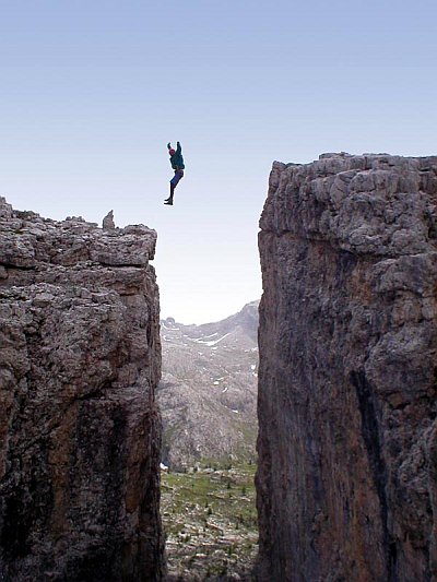 Na některé přeskoky se mi ale stačí jen podívat (to jako stoupnout si na místo odrazu a v dáli v mlze vidět místo dopadu – doletu) a je mi jasné, že bych to zkusil jednou a naposled - víc pokusu by mi život nedopřál. Ale člověk nikdy neví ...
