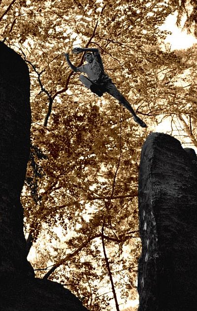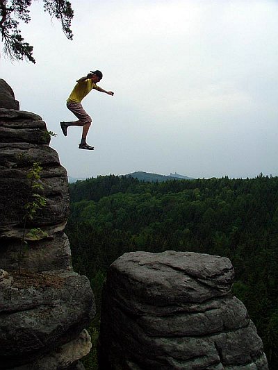 Takhle nějak to u mě propuklo. Zatím nejtěžší přeskok, ke kterému jsem se odhodlal je 3. Na Prachově ze severní Bertovky na východní. Čirou náhodou je to ten přeskok, který jsem před rokem jistil a svíraly se mi půlky jenom jsem to viděl. Taky jsem tak trochu skočit musel, protože jsem si hodil na druhou stranu lano. A slézání není moje hobby. :-]