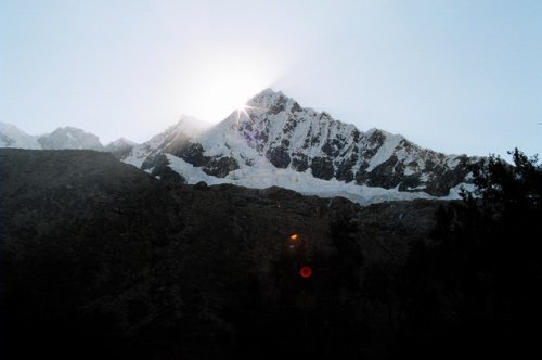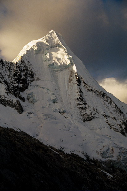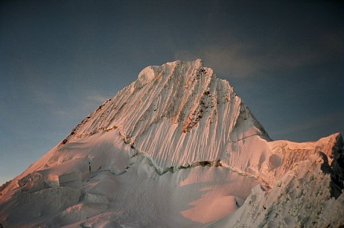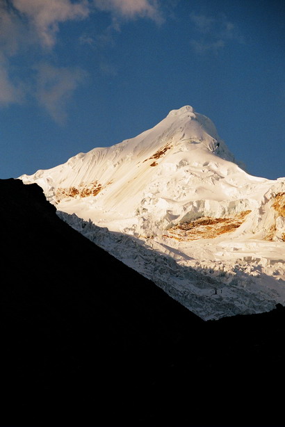 Po dni odpočinku v Yungay jsme za dva dny po stopách známého Santa Cruz treku dorazili do nezvykle prázdného BC pod Alpamayem (5947m). Letos prý ještě na vrcholu nikdo nebyl. Nad Ferarim visel serak, tak všichni lezli akorát na vedlejší Qiutaraju (6040m). My jsme volbu odložili až do chvíle kdy uvidíme JZ stěnu, kterou vedou nejhezčí cesty k vrcholu. Následující den jsme dorazili do sedla mezi Quitaraju a Alpamayem právě, když začalo do JZ stěny Alpamaya svítit slunce. Ferrariho jsme okamžitě zamítli a pro výstup jsme zvolili Francouzkou diretisimu, která vede žlabem přímo na vrchol hory. Cesta vypadla docela bezpečně, ale i tak jsme chtěli být do poledne zpět v sedle. Vyrazili jsme klasicky o půlnoci.