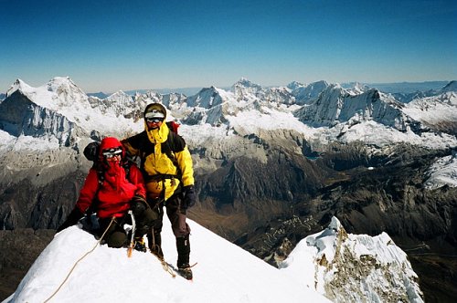 Po Alpamayu jsme byli docela unavení a tak jsme si udělali motorizovaný výlet přes údolí do pohoří Cordillera Negra. Prohlédli jsme si monumentální kytku Puya Raymondi a večer jsme pozorovali západ slunce nad Huascarány. O dalším cíli v té chvíli nemohlo být pochyb. Z Yungay jsme se kolektivem a taxíkem přesunuli do vesničky Musho. Odtud nás čekalo 1600m k chatě Huascaran (asi 4600m), kterou tam po vzoru alpských chat vybudovali Italové. Následující den jsme pokračovali po moréně a plochém ledovci do C1 (5300m). Normální cesta na vyšší jižní vrchol Huascaranu (6768m) je kvůli lavinézním svahům nad sedlem Garganta už druhým rokem neschůdná, proto jsme se s Ondrou rozhodli pro cestu Ecsudo [štít]. Ta z C1 vede ledopádem a mezi 5900m a 6300m překonává sněho-ledovou stěnu o sklonu 50-60st - štít, pak následuje mírný svah k nejvyššímu bodu. Celý výstup proběhl docela v klidu. Jen odtrhovka nás nechtěla hned pustit. Radost nám nezkazila ani nekonečná vrcholová louka s hlubokým sněhem, přece jen jsme byli po měsíci na horách už pěkně aklimatizovaní. Snad jediným zklamáním na vrcholu bylo, že když jsme si chtěli vychutnat pohledy na okolní kopce, tak jsme při tom museli chodit. Zatím vždy stačilo se jen otáčet na místě. Sestup z vrcholu byl nekonečný. Při slaňování se nám několikrát zamotala lana a pod neúprosným sluncem jsme měli neskutečnou žízeň. Nakonec jsme se západem slunce dorazili k chatě a tam jsme si vychutnali poslední noc v horách pod Jižním křížem.