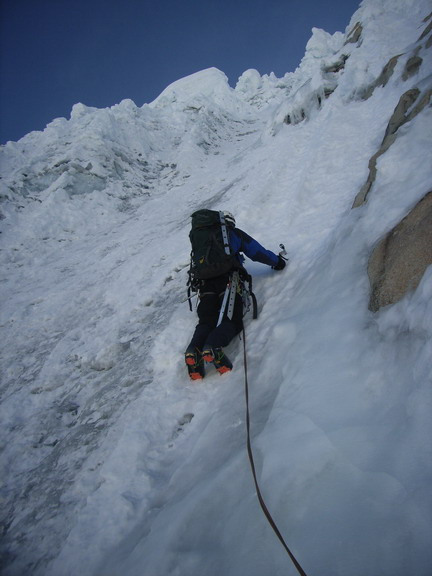 Po překonání ošemetné okrajové trhliny jsme postupovali úzkým vyledněným kuloárem. V předposlední délce nám cestu zahradil asi 80st. výšvih z lámavého ledu. Ještě že to vyšlo na Ondru a já jsem jen chytal kusy ledu, které odlamoval když se probíjel nahoru. Na mě čekalo ještě pár metrů prudkého svahu a v závěru délky už jsem si musel dát rande s typickým nesoudržným rovníkovým sněhem. Na štandu jsem do něj zapíchnul hned tři sněhové kotvy, ale pořád jsem měl pocit, že to není ono. Z místa kam za mnou Ondra dorazil už to bylo na vrchol jen kousek po hřebínku. Nahoře jsme si vychutnávali opojné pocity po poctivém výstupu. Zároveň jsme si uvědomovali, že nás čeká stejně poctivý sestup. Na první slanění jsme vybrali nejdelší kotvu a píchli ji do prašanu. Byl jsem rad, že slaňuji první, protože kdyby chtěla kotva opustit svoje stanoviště, tak by ji Ondra určitě nějak přemluvil. Další slanění už byly za ledové hodiny. Do sedla jsme dorazili asi v jednu, takže skoro v limitu. Když jsem večer dorazil do BC byl jsem opravdu šťastný, že jsme mohli být v plné sezoně sami dva na Alpamayu.