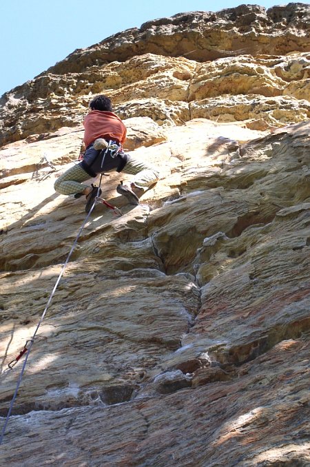 Co se tyce lezeni, tak se musi prejizdet z jednoho utesu k druhemu autem, sic jsou trochu vzdalene od sebe, (stejne jako v Jure). Co se tyce materialu, tak je to mix previsu, previslych a kolmych sten a v par pripadech i ploten. Kolikrat bych spis utvary, ktere jsem tu potkal cekal na vapne. Muzes tu lezt i klasicky viz vyse (TRAD), coz znamena asi tradicional a tudiz musis zhojna vyuzivat vklinence, frendy, atd( to by u nas asi ochranari padli do mdlob). Klasifikace si myslim patri mezi ty mekci, ale tezko se mi to srovnava.Zatim jsem lezl jen ve dvou oblastech a nemohu tedy moc srovnavat.