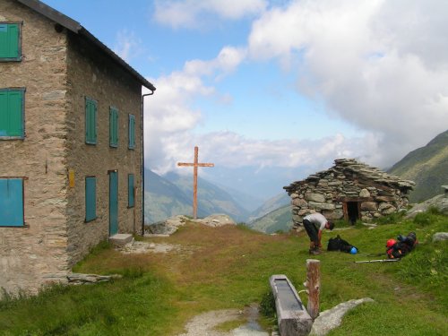 Auto necháváme u zelené přehrady Lac di Place Moulin v komplexu vesniček Bionaz. A míříme opět vzhůru. Jsme teď již dobře aklimatizovaní, takže místo pěti hodin jdeme po pěkné pěšince o hoďku a půl méně. Na chajdě hodně zmatený chatař neví, kam nás má ubytovat, nakonec se ale přeci jen vmáčkneme na palandu. K večeři vařím ze svého, na posilněnou si dáváme žejdlík bezva vína a komunikaci s místními ošlehanými lezci. Po projití návštěvní knihy zjišťujeme, že žádný čech tu snad nikdy nespal...